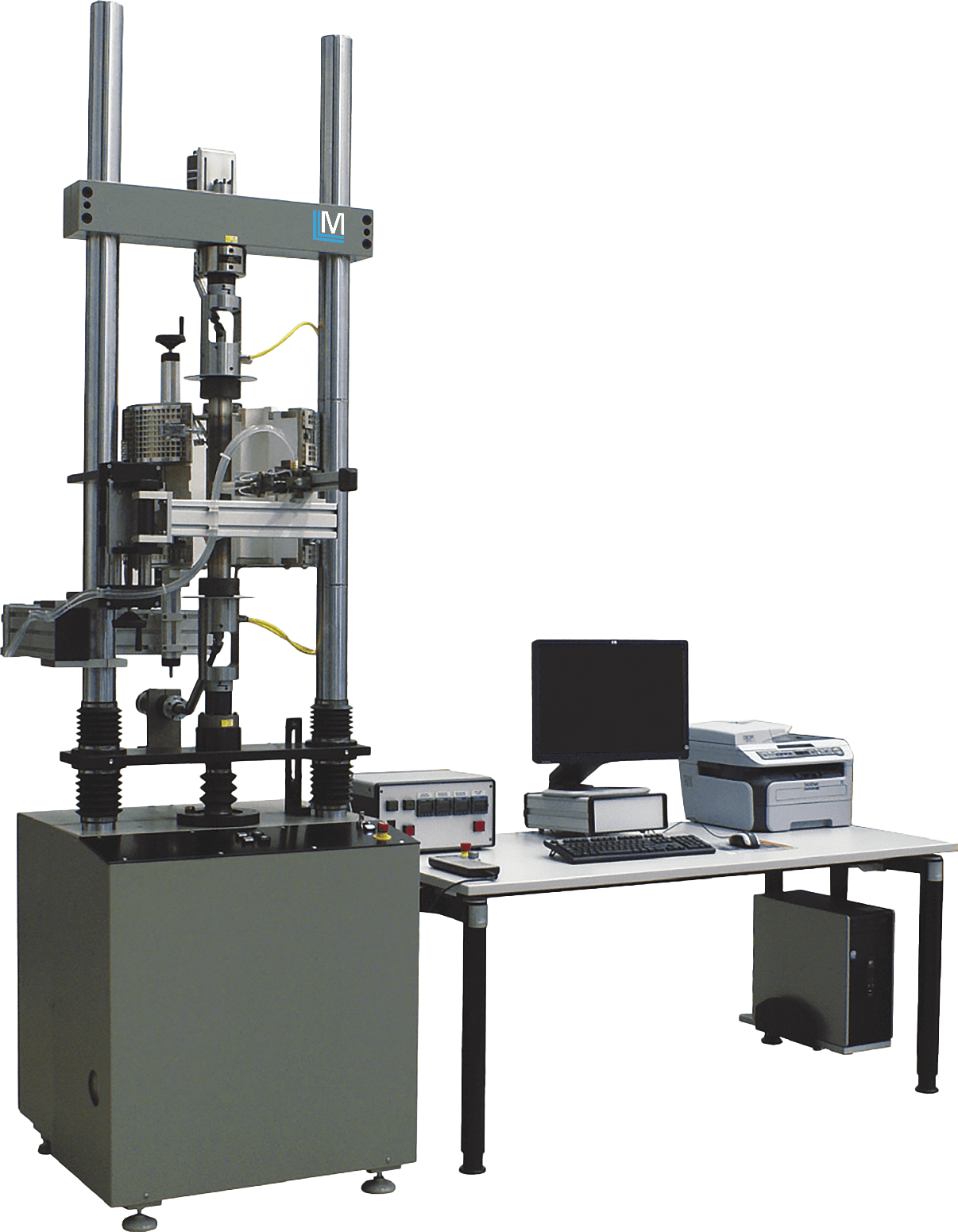 Испытательная машина МЭС-З-10 в двухколонном напольном исполнении с прочными опорными колоннами, гарантирующими высокую продольную и поперечную жесткость рамы нагружении беззазорным центральным шариковинтовым приводом полностью погруженным в масло, что значительно снижает трение и обеспечивает высокую точность управления при низких значениях деформаций и увеличивает жизненный цикл ШВП. Применяются не только для статических испытаний на разрыв, сжатие и изгиб, но и для испытаний на длительную прочность/ползучесть/релаксацию напряжений, малоцикловую усталость (МЦУ) с переходом нагрузки «через 0».