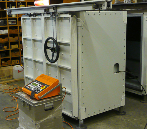 Камера выполнена из свинца и стали, имеет откатную рентгенозащитную крышку. При открытой или неплотно закрытой крышке автоматика камеры блокирует подачу питания на рентгеновский аппарат. Для укладки кабеля питания аппарата предусмотрен специальный рентгенозащитный лабиринт. Для защиты аппарата от перегрева камера оснащена системой вытяжной вентиляции.